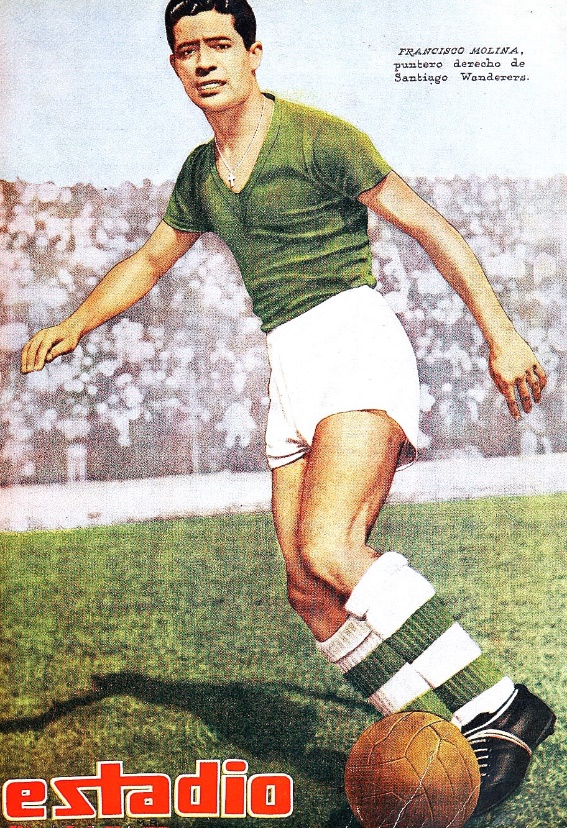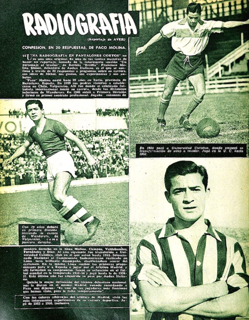 Francisco Molina, catalán trasplantado a Chile, internacional con el país andino, se dejó ver por nuestros estadios sin ocupar plaza de extranjero. En la imagen, honores de poster en la revista “Estadio”, aunque fuese mediante un rústico fotomontaje y con la coloración artificial de hace tres cuartos de siglo.